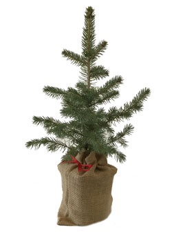 Bei der Pflanzauswahl haben wir die am besten geeignetsten Sorten für Sie ausgewählt. Die beliebte Nordmanntanne und Blaufichte, den eher seltenen Berg-Mammutbaum und die Helmlocktanne sowie die bekannten Pflanzenarten, die Föhre/Kiefer und die Schwarzkiefer. Die genannten Pflanzen werden in einem kleinen Plastiktopf produziert und mit einem dekorativen Jutesäckchen mit roter Kordel geliefert (siehe Bild).