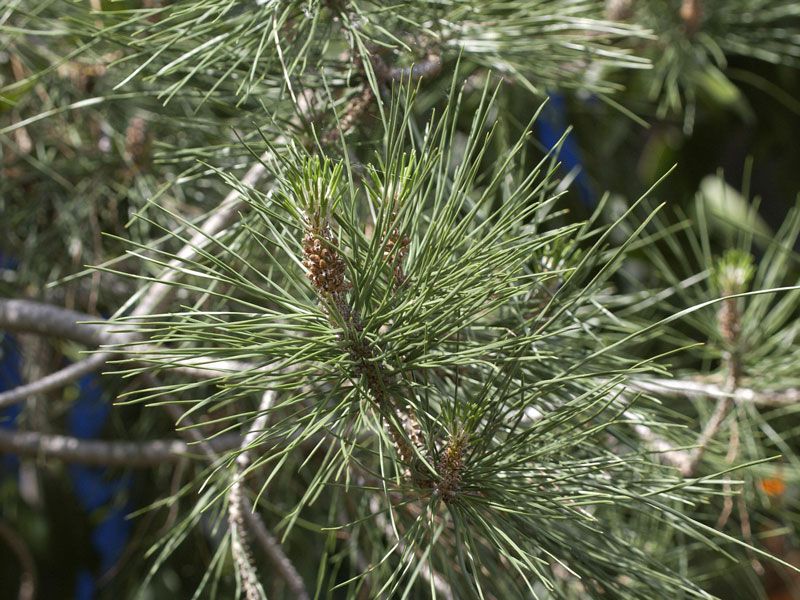 Die hellgrünen Nadeln sind leicht gebogen und werden ca. 15 cm lang. An der Spitze sind diese leicht gelblich. Diese Nadeln sind sehr robust und starr und stehen meistens zu zweit zusammen. Da die Pinie auch stark zu Nadelreinigung neigt, bildet sich sehr bald eine dicke Schicht aus Nadelstreu am Boden. Diese Schicht können Sie immer liegenlassen. Erstens sieht diese sehr gut aus und zweitens bildet diese dicke Nadelmatte einen hervorragenden Winterschutz für die Wurzeln. Mit ca. 15 Jahren ist Pinus pinea geschlechtsreif und bildet erste Blüten und Zapfen aus. Die Blüten erscheinen als gelbe Zapfen im Mai und sondern eine große Menge gelben Blütenstaub ab. Ab Herbst erscheinen dann ca. 10 cm große Zapfen von fast kugelrunder Form. Die Zapfen sind hart und glänzend und beherbergen in jeder Zapfenschuppe zwei Samen. Diese Samen haben eine schwarze und harte Hülle. Diese Hülle kann leicht abgeschält werden, so dass man ganz einfach an den begehrten Samen kommt. Diese ca. 2 cm langen Samen sind eine wahre Delikatesse und können entweder geröstet, oder zu Pesto verarbeitet werden. Diese Samen sind derart beliebt, dass gar nicht genug davon produziert werden können. Bitte nicht erschrecken, wenn die Zapfen lange für die Ausreife benötigen, denn dies kann unter Umständen zwei bis drei Jahre dauern.