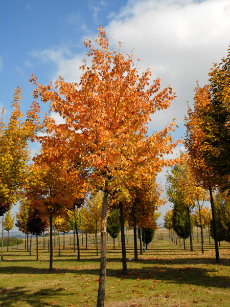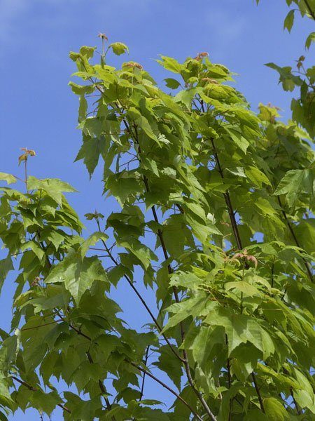 Er wächst entweder ein- oder mehrstämmig und erreicht eine Wuchshöhe von ca. 25 Metern. Möchten Sie einen einstämmigen Wuchs erreichen, sollten Sie die Pflanzen möglichst eng setzen und immer wieder mit Schnittmaßnahmen korrigieren. Dieser Ahorn gehört zu den flachwurzelnden Baumarten und bildet ein stark verzweigtes Wurzelwerk. So eignet er sich hervorragend um möglichst schnell steile Hänge vor Bodenerosion zu schützen. Seine Berühmtheit hat der Rot-Ahorn auf Grund seiner intensiven Herbstfärbung erhalten. Die Blätter scheinen im Spätherbst förmlich am Baum zu glühen. Zudem entwickeln sich im zeitigen Frühjahr noch vor dem Laubaustrieb intensiv-rote Blüten.