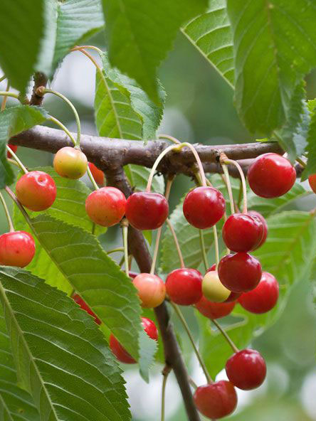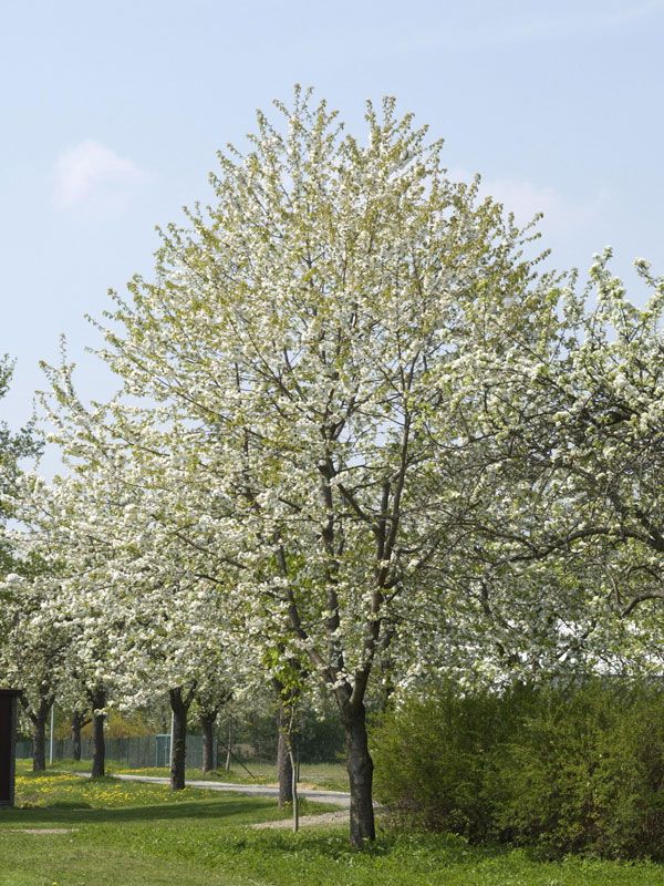 Die Wildkirsche, auch Vogelkirsche oder Waldkirsche genannt, ist die Ausgangsform der meisten Süßkirschen-Kulturformen. Die Wildkirsche bevorzugt sonnige, warme Lagen, besonders wenn genügend Sommerregen fällt. Sie meidet nasskalte, dicht gelagerte Böden, stark wechsel-trockene oder Böden mit zurückstauendem Wasser. In unseren Wäldern wächst sie fast 20 Meter hoch. Die Vogelkirsche hat länglichovale, zugespitzte, grobgesägte Blätter und weiße Blütenbüschel, welche im Mai, gleichzeitig mit den Blättern erscheinen. Die weißen Blüten sind ein schöner Farbtupfer im Frühlingswald, die Kirschen eine beliebte Vogelnahrung.